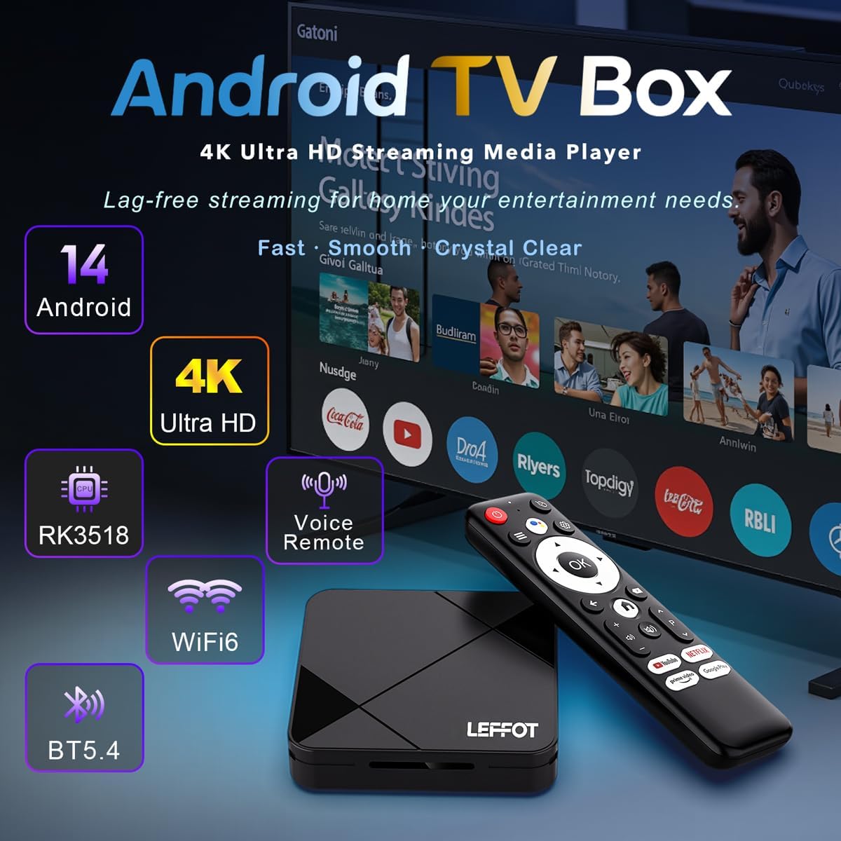Android 14.0 TV Box 2025, LEFFOT RK3518 4K Ultra HD Streaming Device for TV, 2GB RAM 16GB ROM, Smart TV Box with Voice Remote, 2.4G & 5G WiFi 6, BT 5.4, USB 3.0, HDR10, Rockchip RK3518 Quad-Core A53