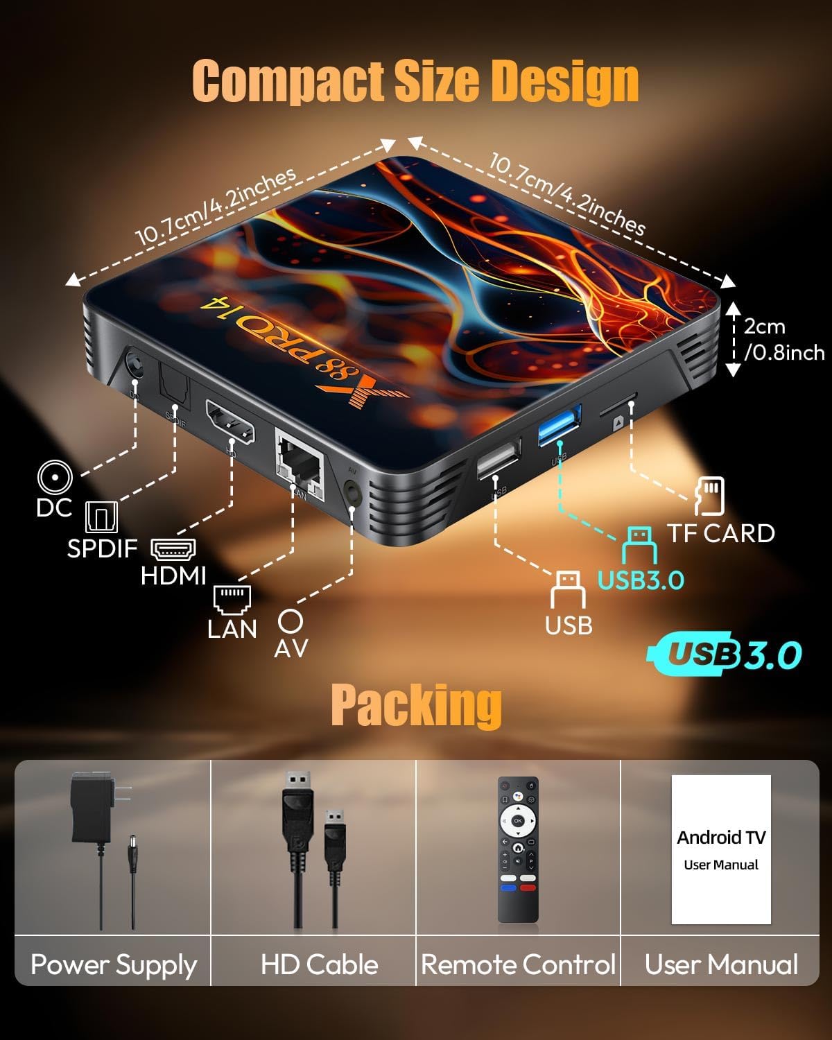 【2.4G/5.8GHz WiFi 6】Android TV Box 14.0 supports WiFi 6 with dual-band 2.4G/5.8GHz wireless connectivity, ensuring a stable connection and buffer-free network access. The USB 3.0 port supports gigabit network adapters, helping you unlock faster network speeds (network speed will depend on your network environment and hardware devices). The Ethernet port supports 100Mbps wired connections, offering multiple options for network connectivity.