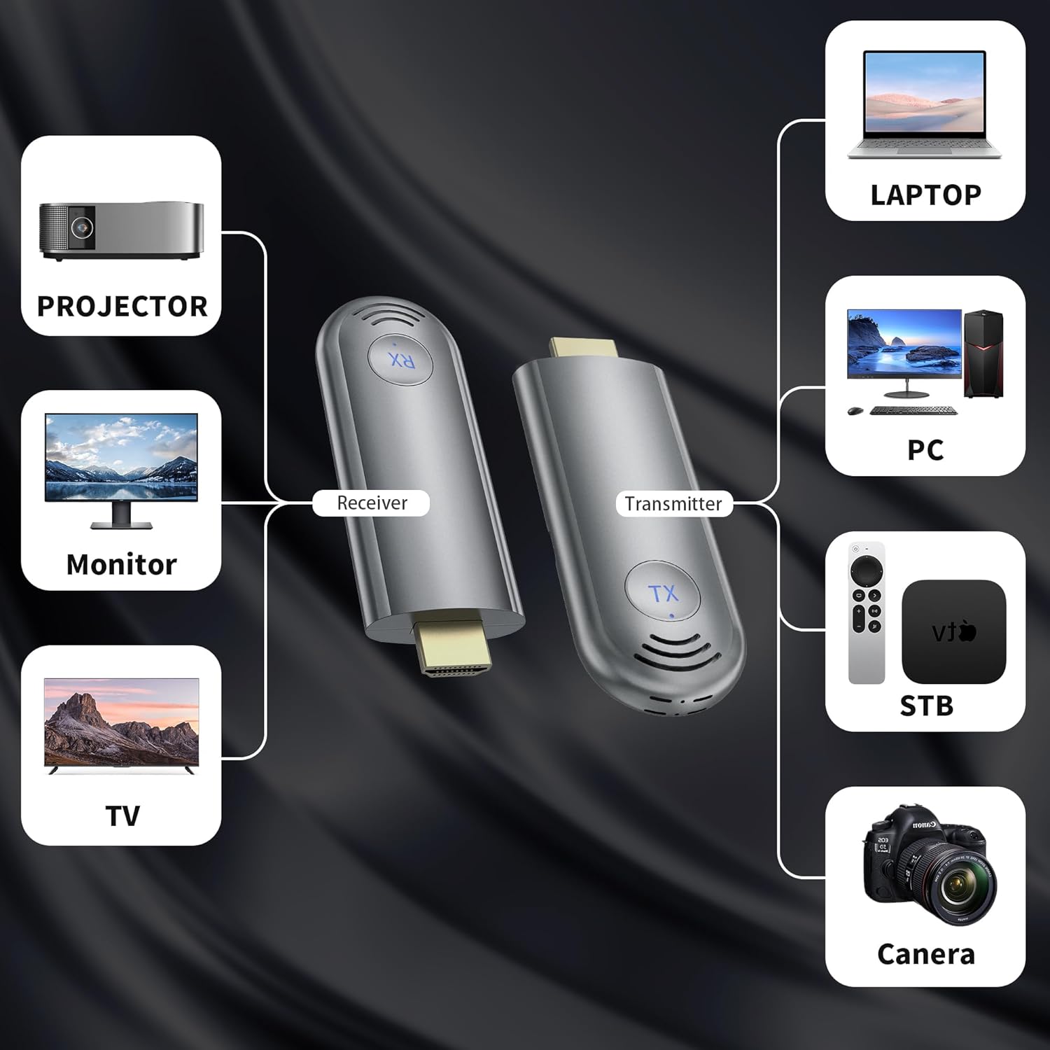 【Wireless Screen Mirroring and Extension Modes】 Wireless HDMI Transmitter and Receiver supports screen mirroring and screen extension functions, allowing you to project the content from devices such as laptops, cameras, and cable TV set-top boxes onto high-definition TVs, projectors, and displays, providing a versatile application experience.